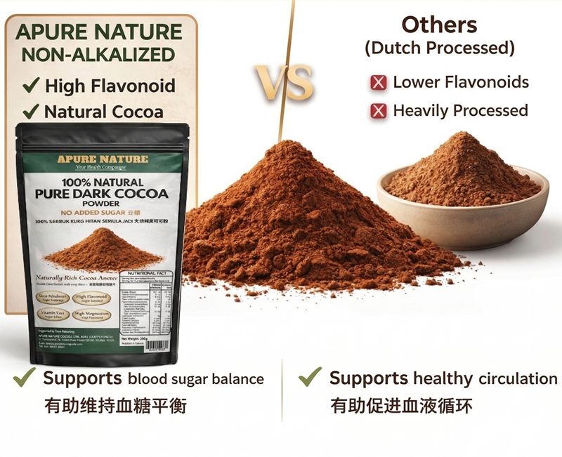 APURE NATURE Natural Dark Cocoa Powder is made from carefully selected High Quality cocoa beans and minimally processed to Preserve Its Natural Cocoa Flavour, Aroma, And Beneficial Plant Compounds. APURE cocoa powder is Non-Alkalized (Not Dutch Processed), retaining its naturally rich colour and authentic cocoa taste. Naturally High In Flavonoids and Antioxidants, it is suitable for daily beverages, smoothies, and baking. With No Added Sugar, No Preservatives & No Artificial Flavoring Or Coloring, it delivers pure cocoa goodness in every serving.